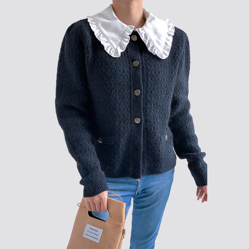 Dear an collar ruffle mar chomhpháirt inscortha nó in -idirmhalartaithe, ag ligean do chustaiméirí a gcuid cardigans a nuashonrú gan baill éadaigh nua a cheannach.